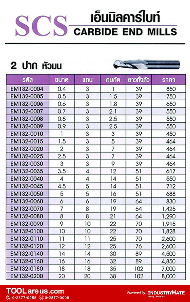 ดอกเอ็นมิลคาร์ไบด์ ยี่ห้อ SCS รุ่นหัวมน (Ball Nose) 2 ปาก